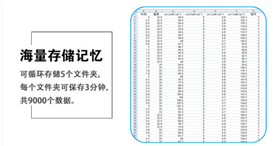 超大容量數(shù)據(jù)存儲(chǔ),手動(dòng)模式可循環(huán)存儲(chǔ)5組3分鐘數(shù)據(jù)組,自動(dòng)模式連續(xù)存儲(chǔ)15分鐘,共9000個(gè)數(shù)據(jù)。