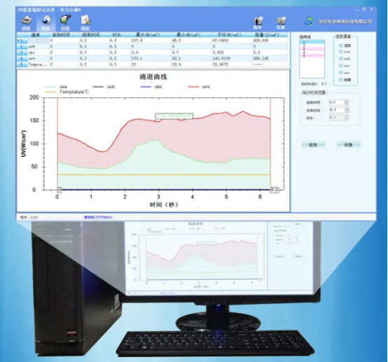 可同時(shí)測(cè)試UVA、UVB、UVC、UVV四種波段UV能量,功率,溫度及時(shí)間的一款多通道能量輻照測(cè)試儀,具有光譜曲線顯示。