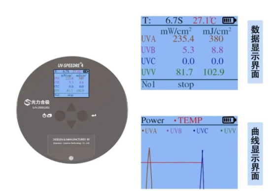 采用1.37英寸彩色屏幕顯示UV能量,UV光功率,溫度,測(cè)試時(shí)長(zhǎng),測(cè)試曲線。