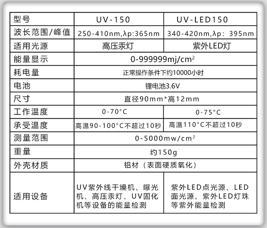 UV-LED150能量計,適用于測試LED光源的能量值,波長范圍340-420nm,中心波長395nm。