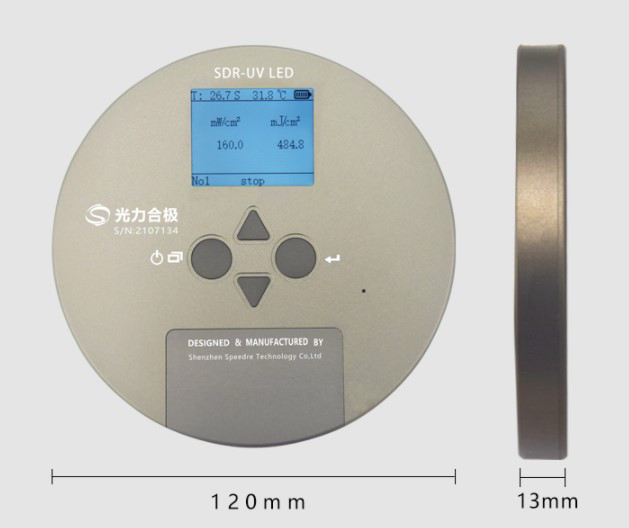 UV光固化原理是紫外線(xiàn)照射特殊膠水使膠水產(chǎn)生聚合反應(yīng)從而固化。在固化過(guò)程中,隨著光源的不斷使用,光源會(huì)出現(xiàn)衰減。因此,我們需要使用一款專(zhuān)業(yè)的UV能量計(jì)(SDR-UV LED)來(lái)檢測(cè)紫外線(xiàn)光源的強(qiáng)度和能量。速德瑞科技生產(chǎn)的SDR-UV LED UV能量輻照記錄儀無(wú)需專(zhuān)業(yè)人員對(duì)數(shù)據(jù)進(jìn)行實(shí)時(shí)記錄,儀器可以循環(huán)存儲(chǔ)5組數(shù)據(jù)15分鐘時(shí)長(zhǎng),且具有軟件分析功能,可對(duì)每次所測(cè)試的時(shí)間、能量、光強(qiáng)及溫度對(duì)比分析制定一個(gè)固定的方案來(lái)監(jiān)測(cè)機(jī)器作業(yè)。