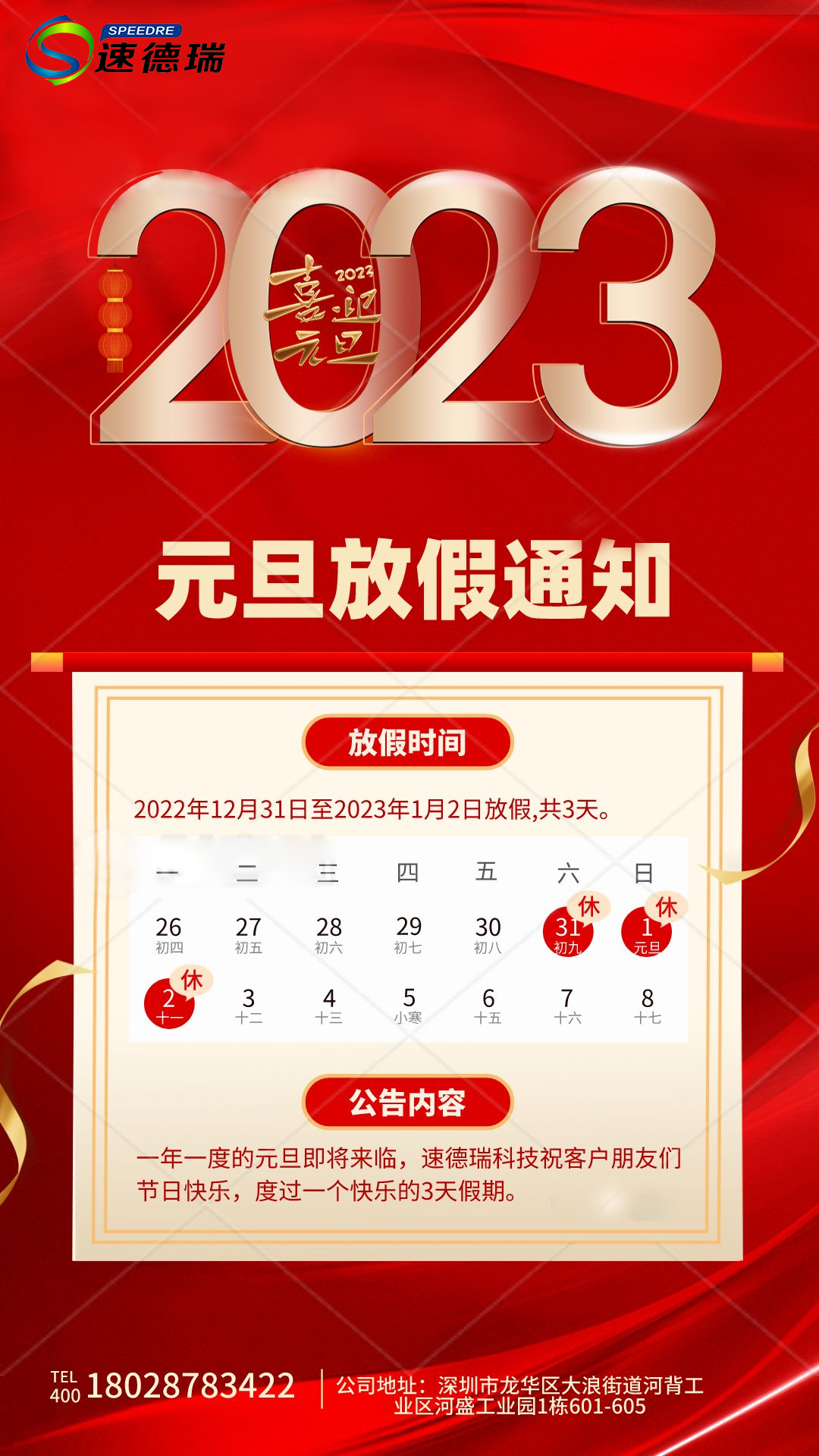 速德瑞科技2023年春節(jié)放假通知