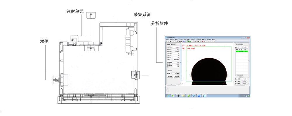 如上圖、接觸角測量儀主要由光源、注射單元、采集系統(tǒng)、分析軟件四大部分組成,設(shè)備采用光學(xué)成像的原理。