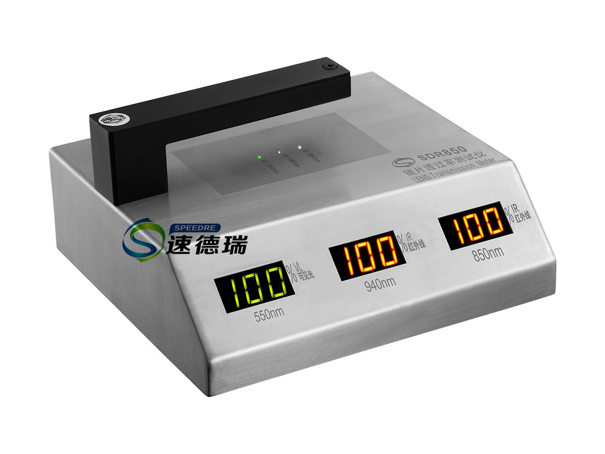 SDR850手機(jī)面板IR測(cè)試儀的測(cè)試原理是采用紅外850nm 光源,紅外940nm 光源和可見(jiàn)550nm 光源照射被測(cè)透明物質(zhì),感應(yīng)器分別探測(cè)三種光源的入射光強(qiáng)和透過(guò)被測(cè)透明物質(zhì)后的光強(qiáng),透過(guò)光強(qiáng)與入射光強(qiáng)的比值即為透過(guò)率,用百分?jǐn)?shù)表示