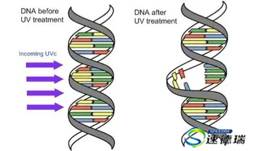 UVC對細菌、病毒等微生物的照射,會破壞微生物機體細胞中的DNA(脫氧核糖核酸)或RNA(核糖核酸)的分子結(jié)構(gòu),引起DNA鏈斷裂、核酸和蛋白的交聯(lián)破裂,造成生長性細胞死亡和再生性細胞死亡,達到殺菌消毒的效果。