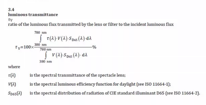 對(duì)于鏡片來(lái)說(shuō),透光率一般指的是可見(jiàn)光透射比。根據(jù)國(guó)際標(biāo)準(zhǔn)ISO8980-3,即光譜透射比(透射出的光通量跟入射光通量的比)與D65標(biāo)準(zhǔn)光源光譜分布以及視見(jiàn)函數(shù)(可以理解為眼睛對(duì)日光內(nèi)各種顏色的敏感程度)為權(quán)重因子的函數(shù)。