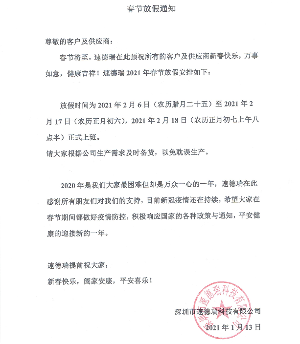 春節(jié)將至,速德瑞科技在此預(yù)祝所有的客戶及供應(yīng)商新春快樂,萬事如意,健康吉祥!速德瑞2021年春節(jié)放假安排如下: